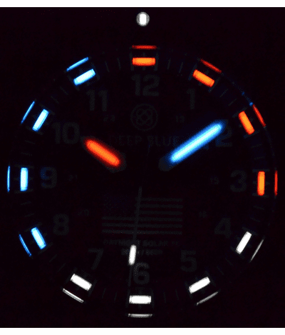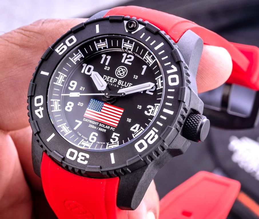 DAYNIGHT 43MM DIVER SOLAR POWERED PC USA TRITIUM WATCH- BLACK/WHITE BEZEL - WHITE NUMBERS USA FLAG 3 COLOR TRITIUM TUBES – STRAP