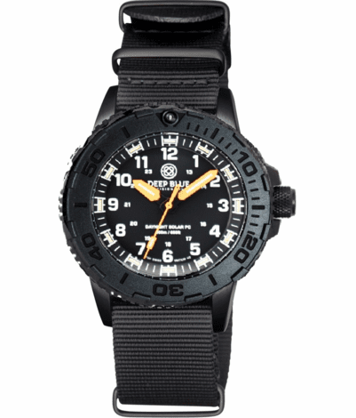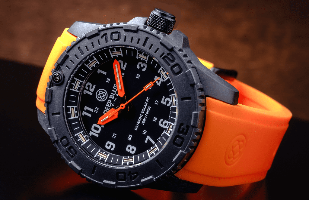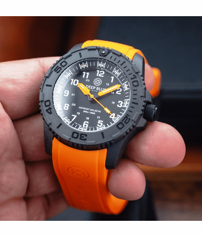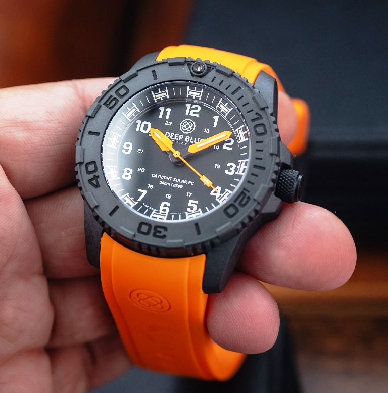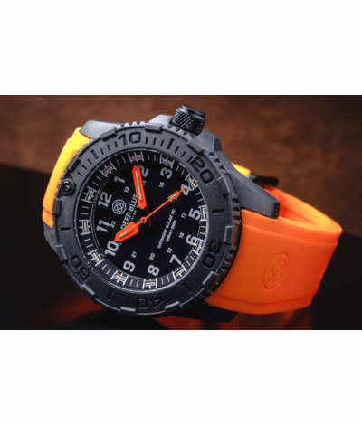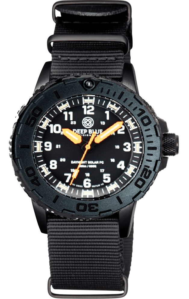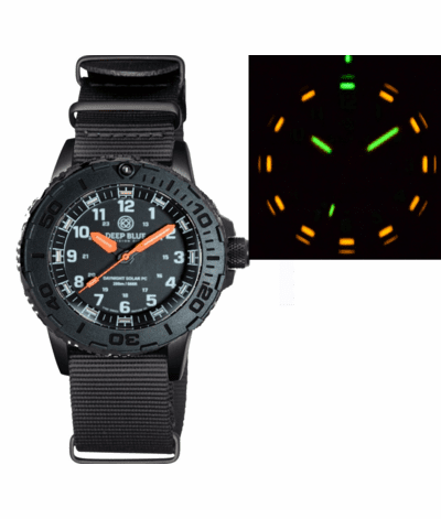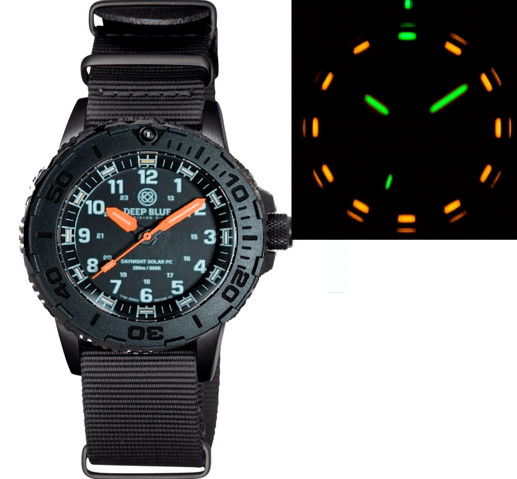 DAYNIGHT 43MM DIVER SOLAR POWERED PC TRITIUM WATCH- STEALTH BEZEL - WHITE NUMBERS - ORANGE HANDS 2 COLOR TRITIUM TUBES – STRAP