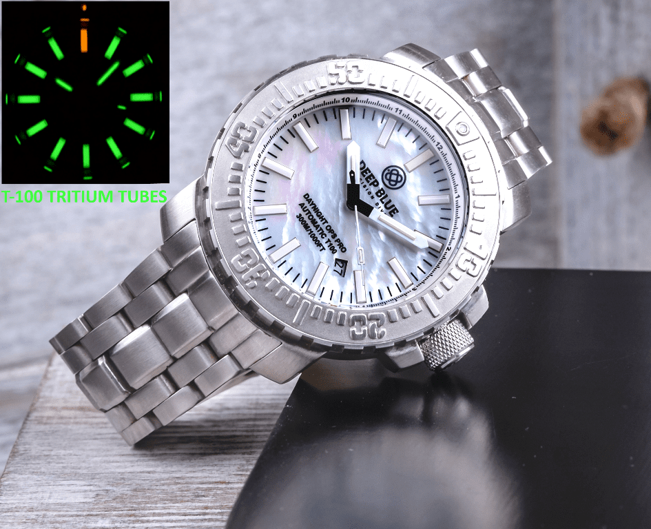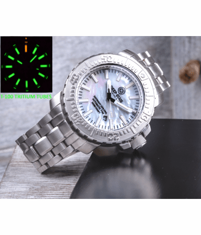 Home | DIVE WATCHES | DAYNIGHT OPS PRO TRITIUM TUBES T-100 AUTOMATIC 46MM STAINLESS BEZEL - BRACELET | DAYNIGHT OPS PRO TRITIUM TUBES AUTOMATIC 46MM STAINLESS STEEL BEZEL WHITE MOTHER OF PEARL DIAL - BRACELET GREEN/ORANGE TRITIUM TUBES
