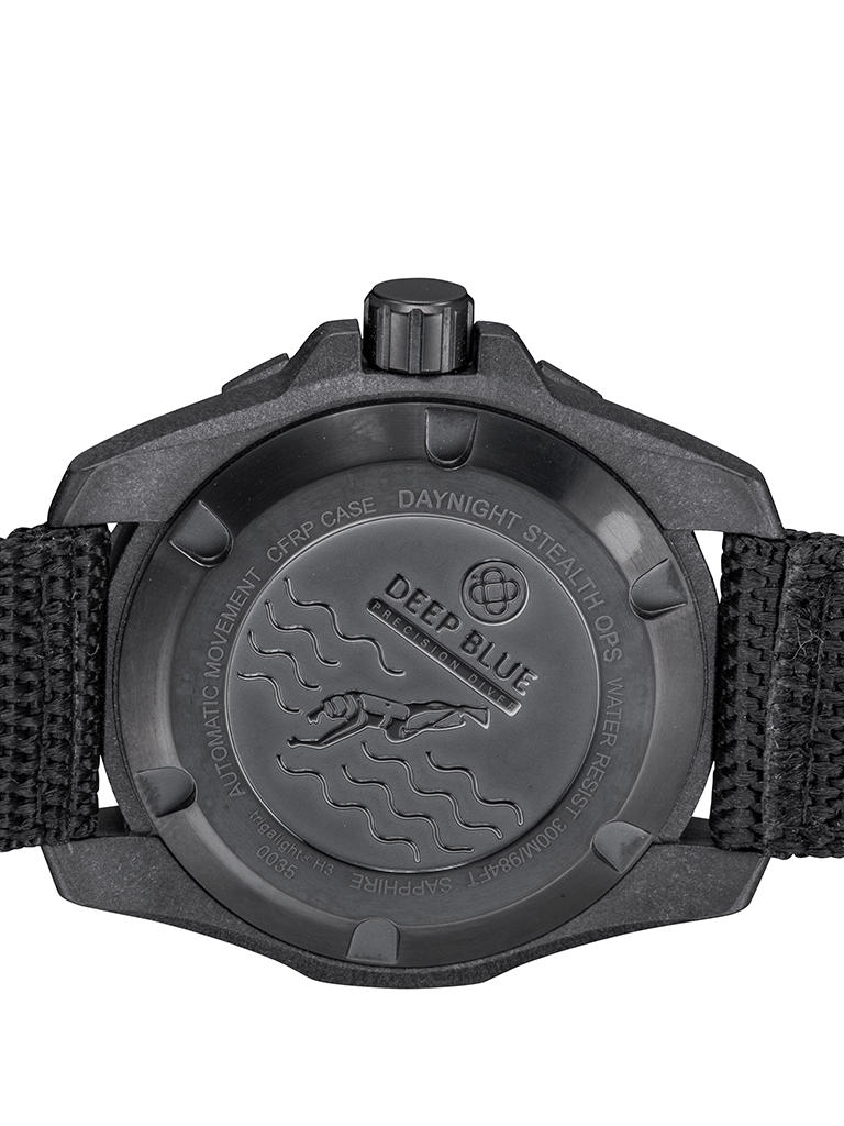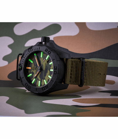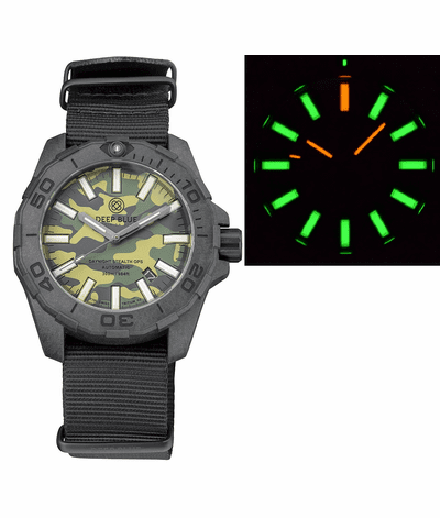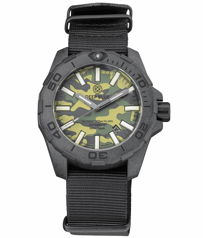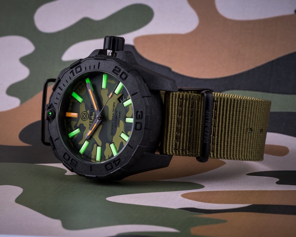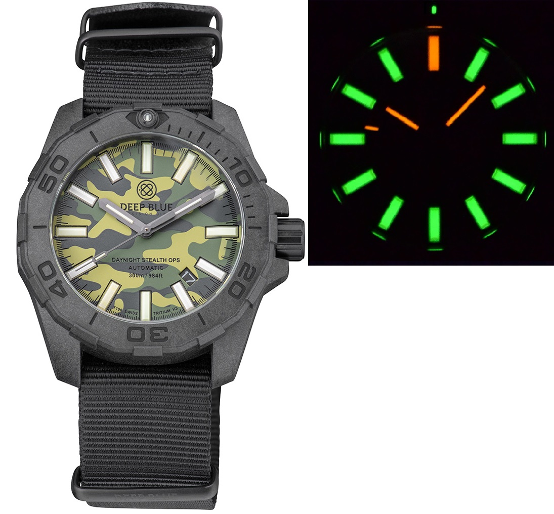 DAYNIGHT STEALTH OPS CARBON CASE GREEN CAMO DIAL GREEN/ORANGE TRITIUM TUBES AUTOMATIC WATCH SCREW DOWN CROWN