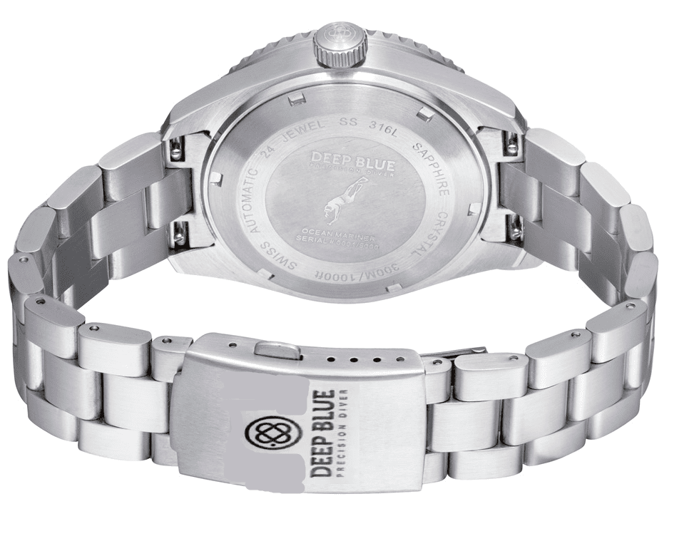 Screw Down crown and Caseback, Caseback Etched with Deep Blue Diver Logo