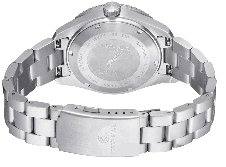 Screw Down crown and Caseback, Caseback Etched with Deep Blue Diver Logo